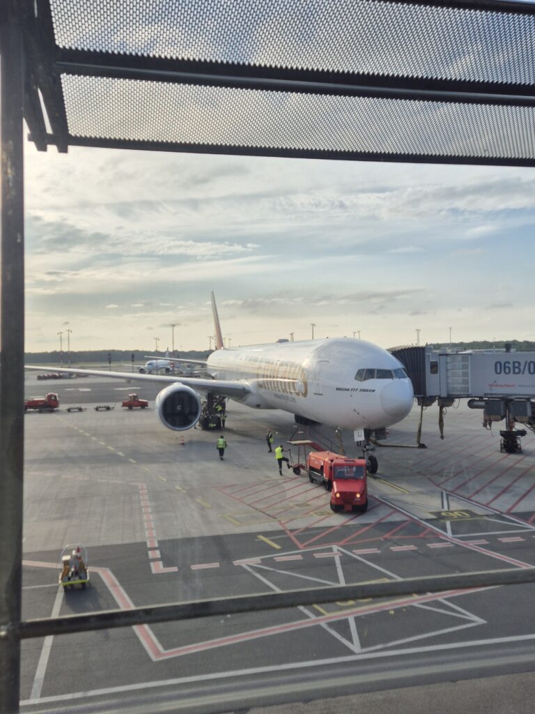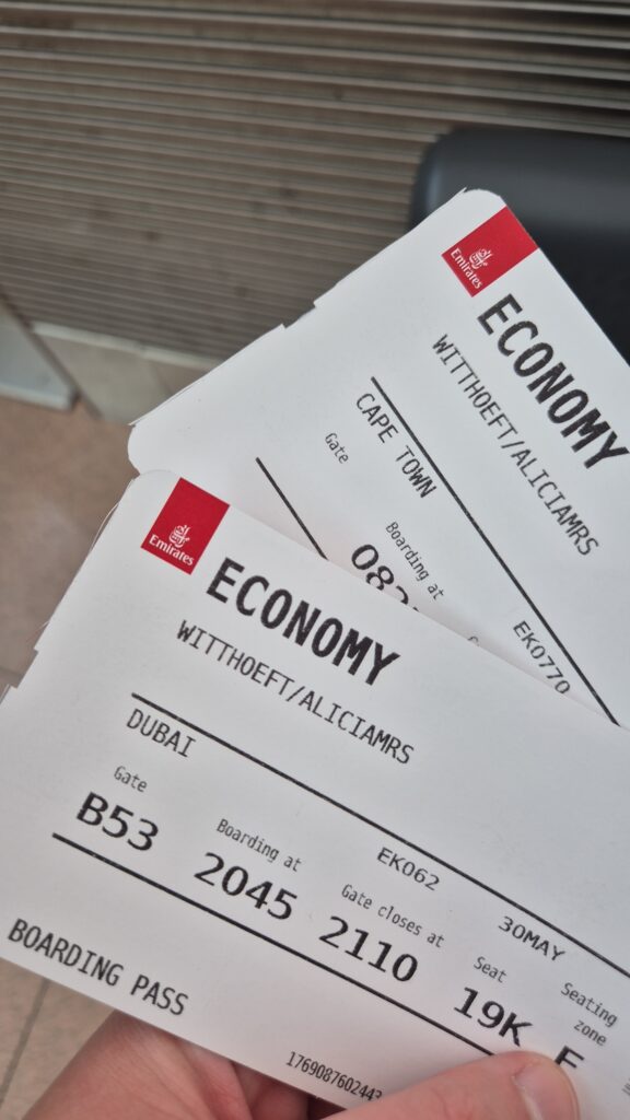 Für mich geht es dann endlich los nach Hamburg. Fahrzeit war mit knapp einer Stunde sehr angenehm. Am Flughafen angekommen, den richtigen Check-In Schalter gefunden, beginnt die Anspannung. Der erste Langstreckenflug steht bevor und die Angst, dass ich Übergepäck habe, wurde größer 😅 Doch die 23 KG wurde knapp unterschritten. Puh, ein Glück 😂Auch das Handgepäck wird von Emirates gewogen. Aber alles ohne Probleme. Ich erhalte auch direkt beide Bordkarten, da es für mich von Hamburg über Dubai nach Kapstadt geht.