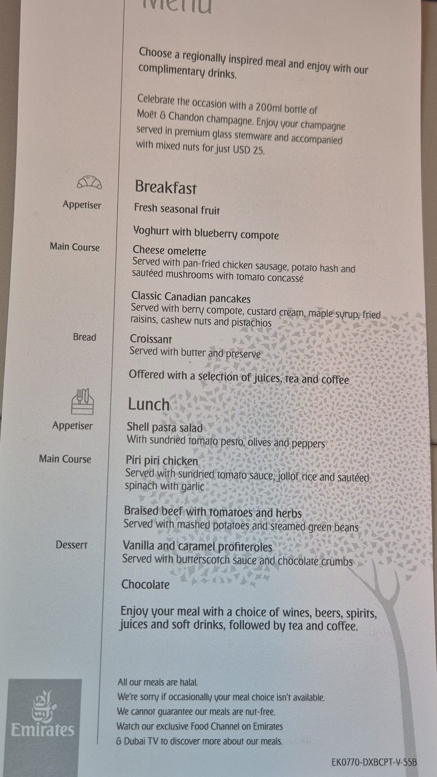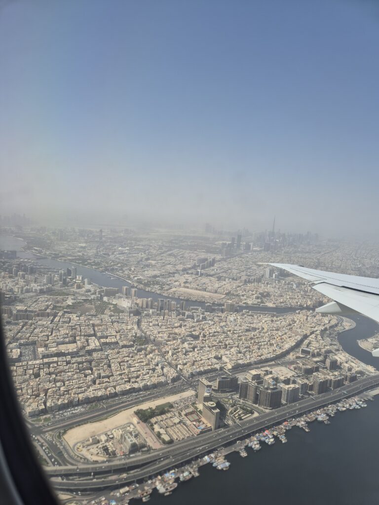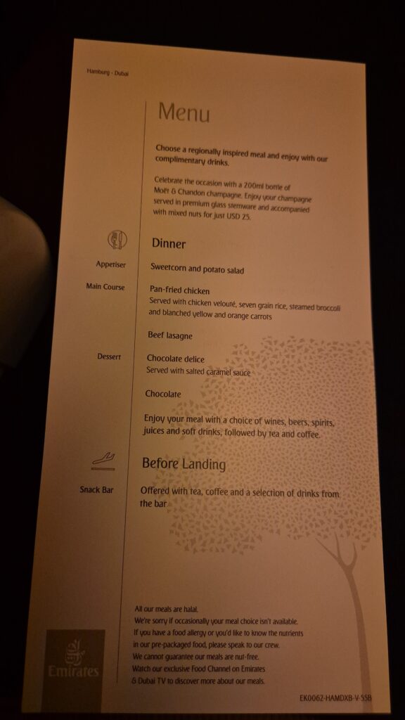 Schon in der Luft, gibt es die Speisekarte. Bis es dann aber endlich auch das Essen gibt, ist es schon nach 23 Uhr. Dafür ist es dann aber recht lecker. 🥘Nach knappen 6 ½ Stunden Flug, landen wir in Dubai.