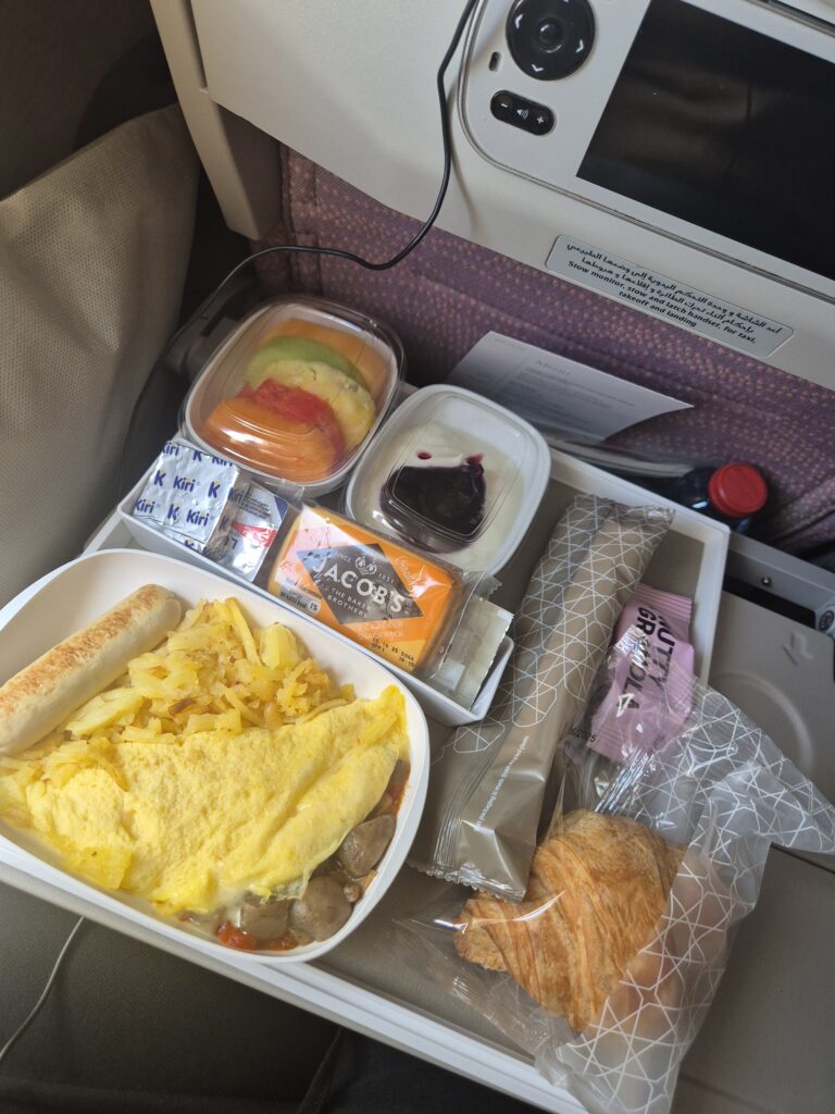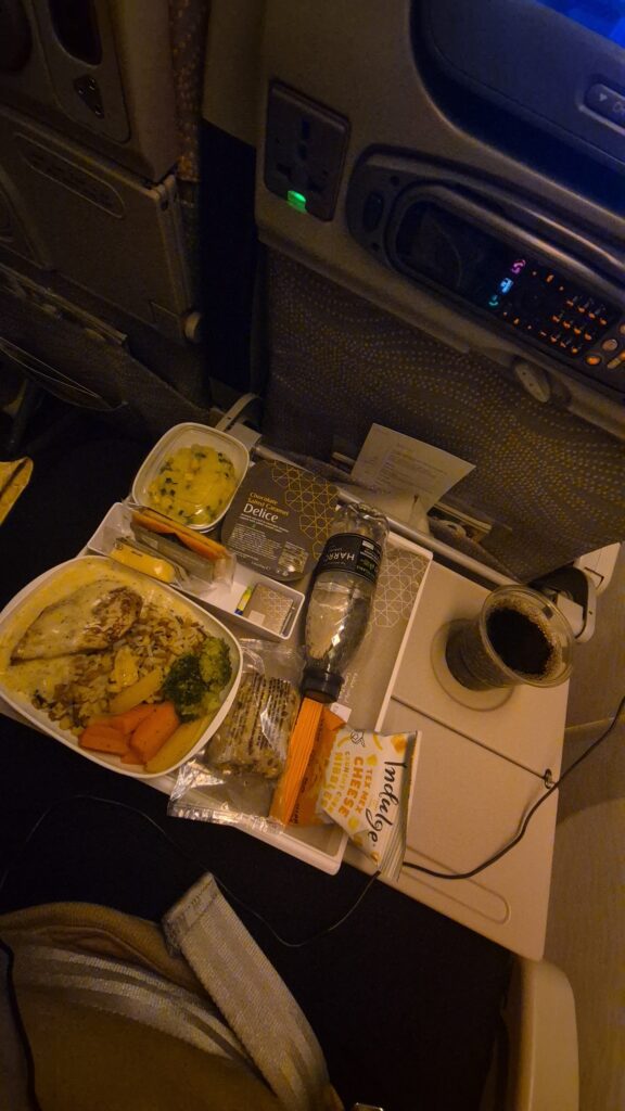 Auch auf dem Flug, ein sehr angenehmer, wird nicht am Essen gespart. Kaum gestartet stand schon das Frühstück an. Zwischendurch dann etwas Entertainment und fehlenden Schlaf nachholen, da kommt schon das Mittagessen.